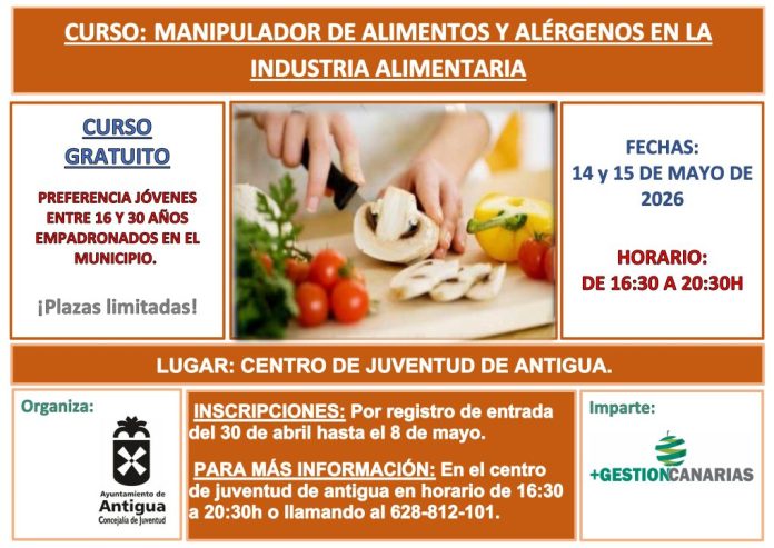 El Ayuntamiento de Antigua ha puesto en marcha un curso gratuito de Manipulador de Alimentos y Alérgenos dirigido a jóvenes del municipio, con el objetivo de mejorar su empleabilidad en sectores como la hostelería y los servicios.
