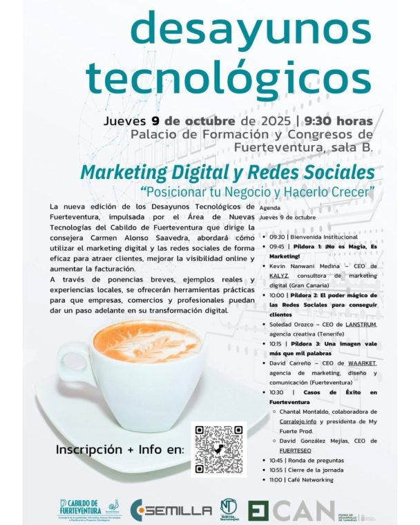 El Cabildo de Fuerteventura, a través de la Consejería de Nuevas Tecnologías que dirige Carmen Alonso, celebra una nueva edición de los Desayunos Tecnológicos, que tendrá lugar el miércoles 9 de octubre en el Palacio de Formación y Congresos, de 9:30 a 11:00 horas. El encuentro, gratuito y abierto al público, estará dedicado al marketing digital y el uso de redes sociales para mejorar la visibilidad online, atraer clientes y aumentar la facturación.