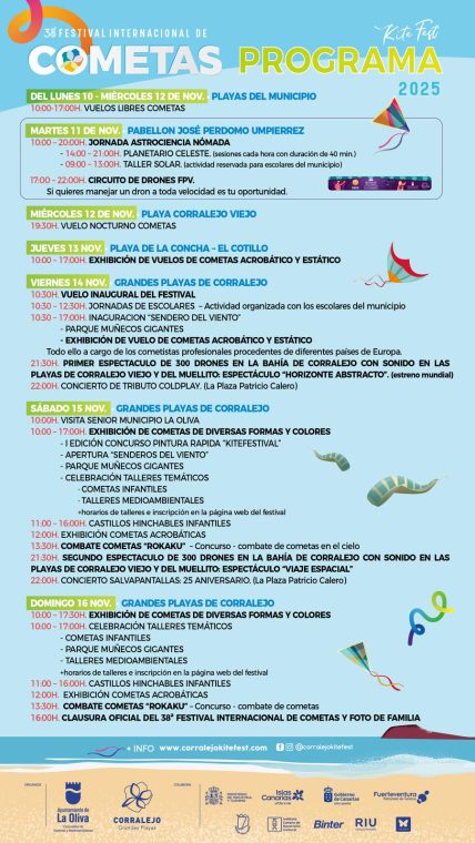 Entre las novedades de esta edición destacan una jornada de astrociencia, un circuito de drones FPV, un parque de muñecos gigantes y el primer Concurso de Pintura Rápida ‘Kitefestival’. Además, el esperado espectáculo nocturno de drones regresa al Muellito de Corralejo los días 14 y 15 de noviembre, con un despliegue ampliado de 300 drones.