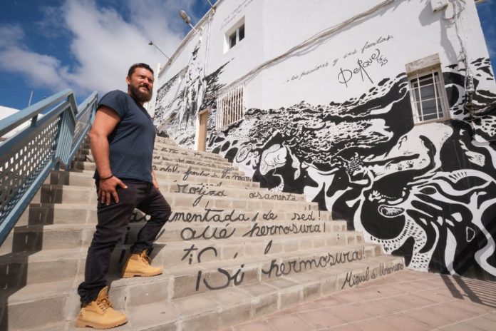 La intervención se desarrolló en la zona de Las Escuevas, e incluyó un proceso integral de restauración: desde el raspado y tratamiento de las áreas afectadas por la humedad, hasta el repintado completo del muro, la integración visual del cableado y la recuperación del texto de Miguel de Unamuno inscrito en los peldaños de la escalera anexa.