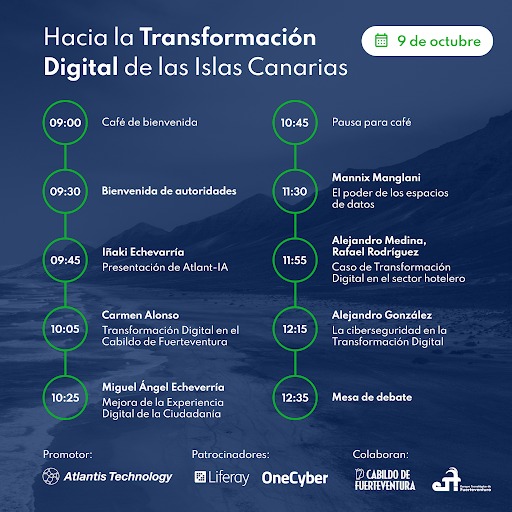 Organizado por Atlantis Technology, con la colaboración del Cabildo de Fuerteventura y su Parque Tecnológico, el evento busca consolidarse como referencia en transformación digital. La consejera de Nuevas Tecnologías, Carmen Alonso, y el coordinador de Innovación, Rayco León, acompañarán a expertos como Miguel Ángel Echeverría (Liferay), Iñaki Echeverría (Atlantis Technology), Mannix Manglani (MNX Online), Rafael Rodríguez (R2 Hotels), Alejandro González (Onecyber) y Alejandro Medina (Atlantis Technology).