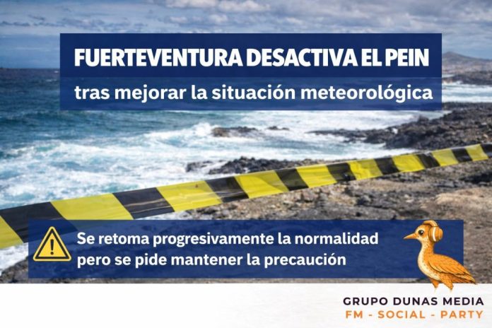 El Cabildo de Fuerteventura ha desactivado el Plan Territorial Insular de Emergencias de Protección Civil (PEIN) desde las 00:00 horas de este sábado, tras la actualización de las alertas meteorológicas por parte de la Dirección General de Emergencias del Gobierno de Canarias, que pasan a situación de prealerta.