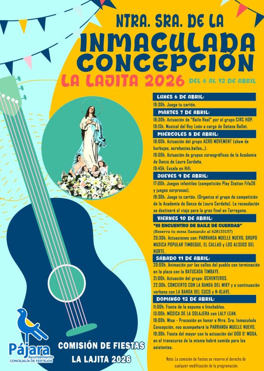 La localidad de La Lajita ya se prepara para celebrar las fiestas en honor a Nuestra Señora de la Inmaculada Concepción, que tendrán lugar del 6 al 12 de abril con una programación que incluye más de una quincena de actos dirigidos a todos los públicos.