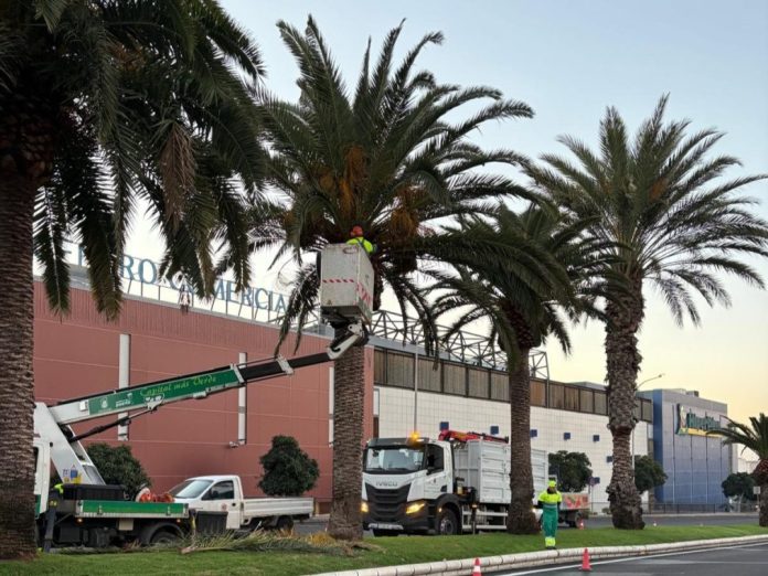 Según informó el Consistorio, estos días se actúa en la mediana junto al Centro Comercial, donde se están realizando labores de poda para garantizar el correcto desarrollo de las palmeras y reforzar la visibilidad en la zona.