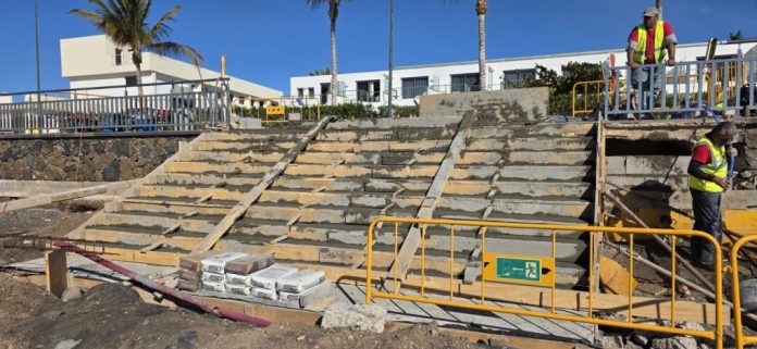 Los trabajos, ejecutados a través del Servicio de Obras y Maquinaria del Cabildo, permitirán recuperar el acceso a la arena desde el paseo, situado a varios metros de altura en este punto, tras los daños ocasionados por un temporal que destruyó la escalera anterior. La nueva infraestructura se construye con hormigón especialmente formulado para resistir el entorno marino, incluyendo la acción de sulfatos y cloruros.
